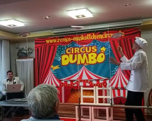 Der Cirkus Dumbo brachte den Bewohnern des Elisabethstifts echte Zirkusatmosphäre direkt ins Haus. In Landshut ist der Zirkus vielen als „Landshuter Weihnachtszirkus“ bekannt. Umso größer war die Freude, das Ensemble nun hautnah bei uns erleben zu dürfen.