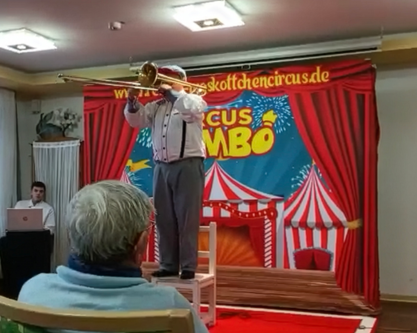 Mit Tellerjonglage, beeindruckender Handstandakrobatik, einem humorvollen Clown, Messerwurf sowie musikalischen Einlagen mit Posaune und Gesang begeisterten die Künstlerinnen und Künstler unser Publikum. Auch unsere Bewohnerinnen und Bewohner wurden immer wieder humorvoll in das Programm eingebunden – die Freude und der Applaus waren groß. Viele erinnerten sich an frühere Zirkusbesuche und genossen die besondere Atmosphäre sichtlich.